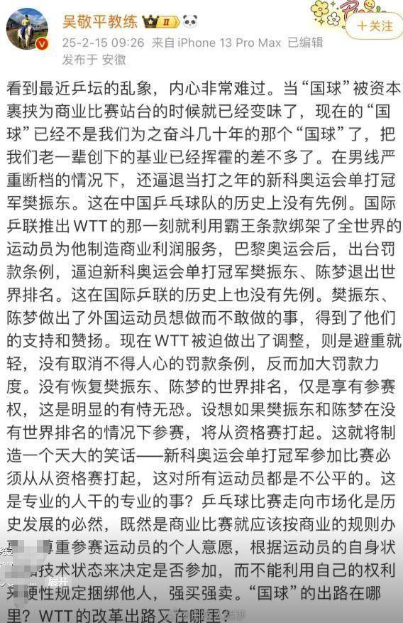 就在新规公布后不久,12月27日,樊振东在个东谈主酬酢账号上发文,精采晓示退出宇宙排行,但明确暗示我方不会退役。他坦言,果然无力承受新规带来的压力,只可遴荐这种口头信守可爱。